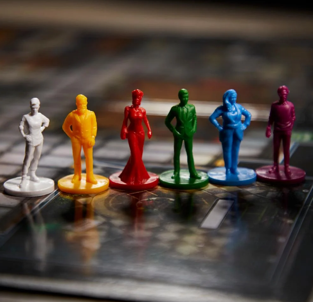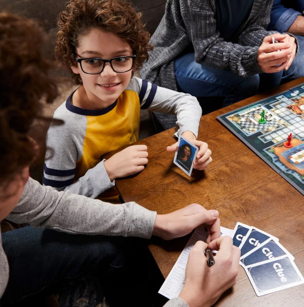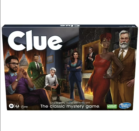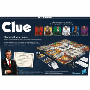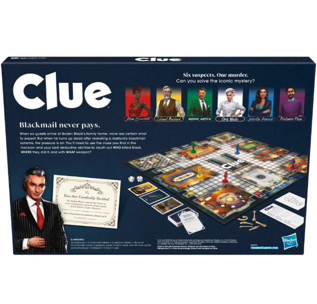 includes game board, 6 character tokens, 6 weapon tokens, 50 cards (6 character cards, 6 weapon cards, 9 room cards, and 29 Clue cards), solve envelope, notepad, 2 dice, and rules.