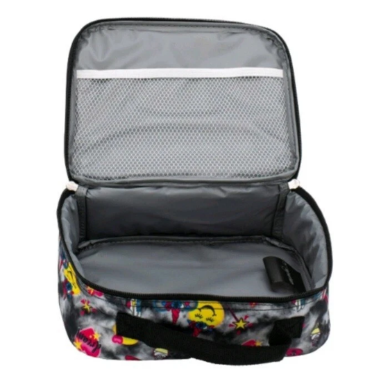 Insulated Interior compartment | name tag | zipper closure | single handle for easy carrying | sandwiches, snacks, drinks… | 100% Polyester | 25 x 20 x 9 Cm